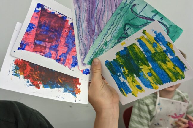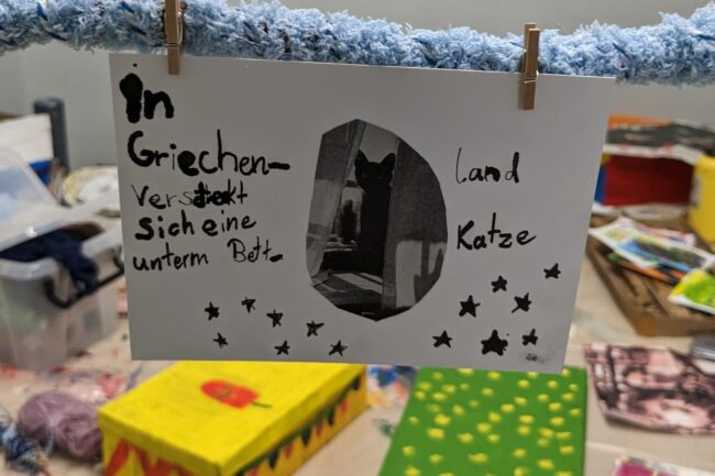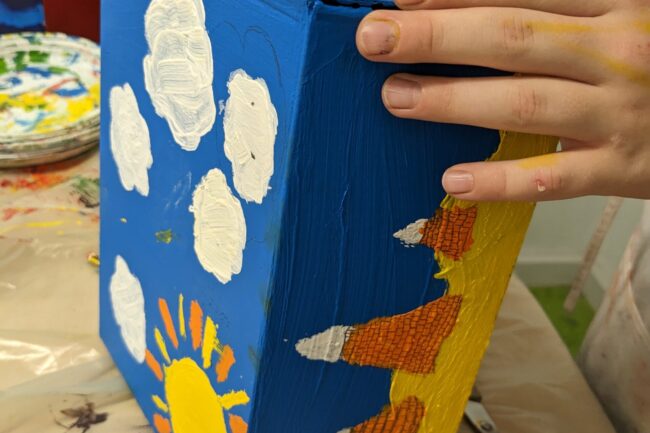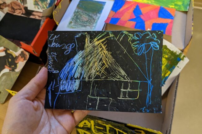 Der zweite Workshop lud die Teilnehmer*innen ein, Postkarten mit verschiedenen Techniken zu gestalten, um ihre besten Erinnerungen festzuhalten und sie auf ihrer selbst dekorierten Schatzkiste aufzubewahren.