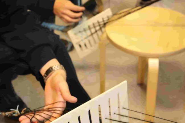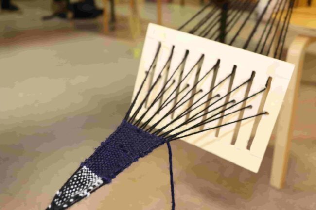 Die diesjähreigen drei Workshops wurden aus der Perspektive von Textil-Design, Choreografie und Medien entwickelt. In der Gruppe Textil-Design wurden eigene Taschen-Webstühle gebaut und anschließend mit ihnen gewebt. Dabei verbindet man sich mit dem Wbstuhl an einem festen Gegenstand (z.B. einem Tischbein) und beginnt zu weben. die SuS der 9. Klasse einem Gymnasiums haben Farben und Formen frei gewählt.