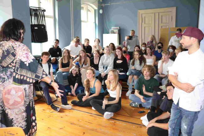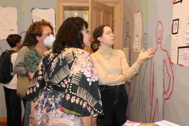 Für die Präsentation wurde das Haus zu einer Art Galerie. Alle drei Präsentationen fanden auf drei verschiedenen Etagen statt und wurde „erlaufen“. Schlussendlich kam es im letzten Raum zu einem Austausch zwischen der Autorin und den Schüler*innen, wobei auch Bücher signiert wurden.