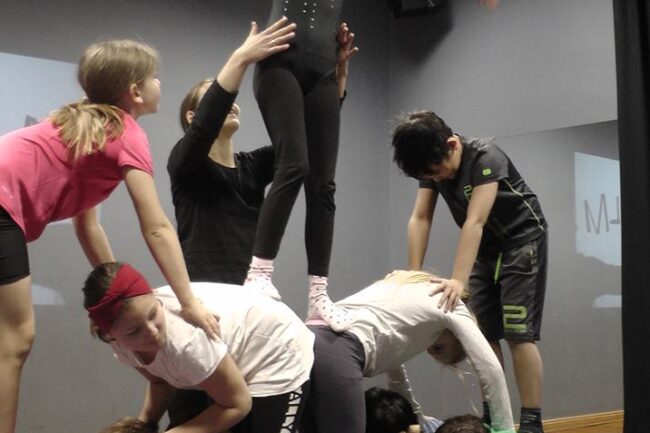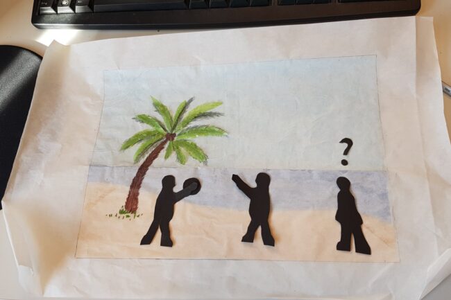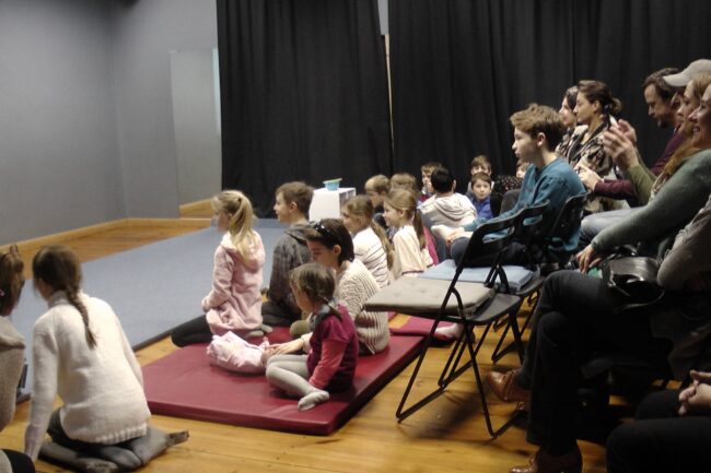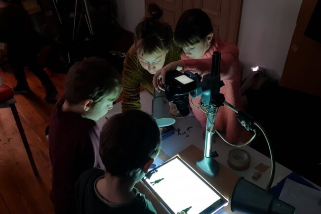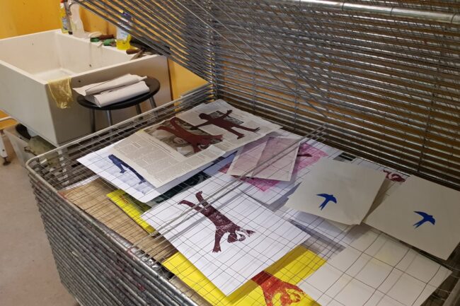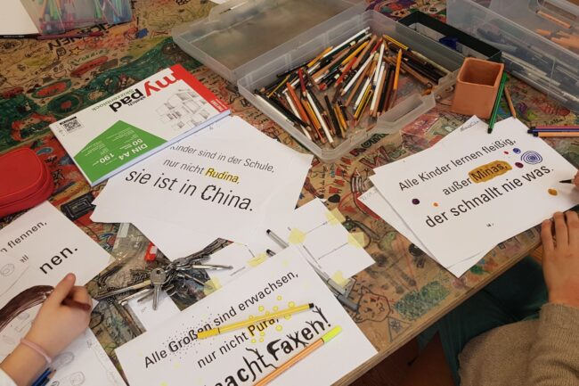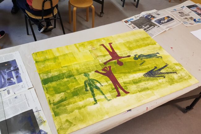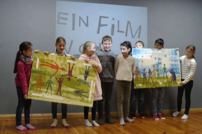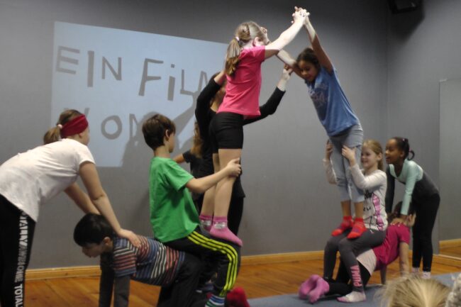 Eine Projektwoche in Zusammenarbeit mit der Philipp-Schaeffer-Bibliothek und Schüler*innen der Kastanienbaumgrundschule. Ausgehend von eigenen Reimen arbeiteten die Schüler*innen über mehrere Tage in Kleingruppen in drei verschiedenen Werkstätten – Akrobatik, Trickfilm und Zeichnen/Drucken.