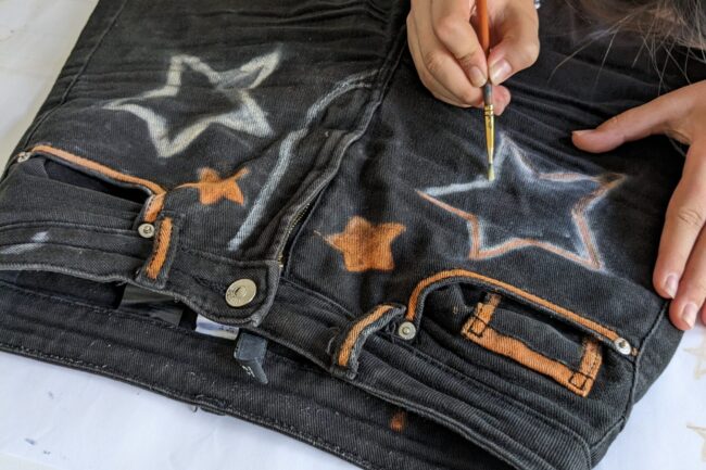 Tag 2: Wir haben mit Bleiche experimentiert und unseren alten Shirts und Jeans neues Leben eingehaucht. Mit verschiedenen Mustern und Techniken haben wir sie richtig individuell gestaltet.