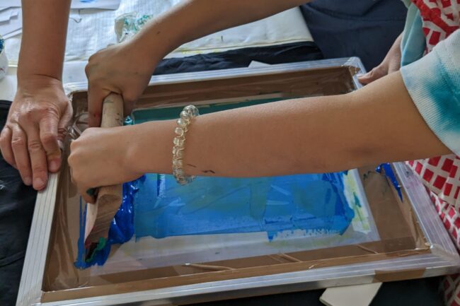 Tag 3: Stempelzeit! Wir haben unsere eigenen Stempel mit Moosgummi hergestellt und sie dann auf T-Shirts, Hosen und Beutel gedruckt. Jedes Kleidungsstück hatte jetzt diesen persönlichen Touch, der sie einzigartig gemacht hat. Es war erstaunlich zu sehen, wie aus einfachen Sachen echte Kunstwerke wurden.