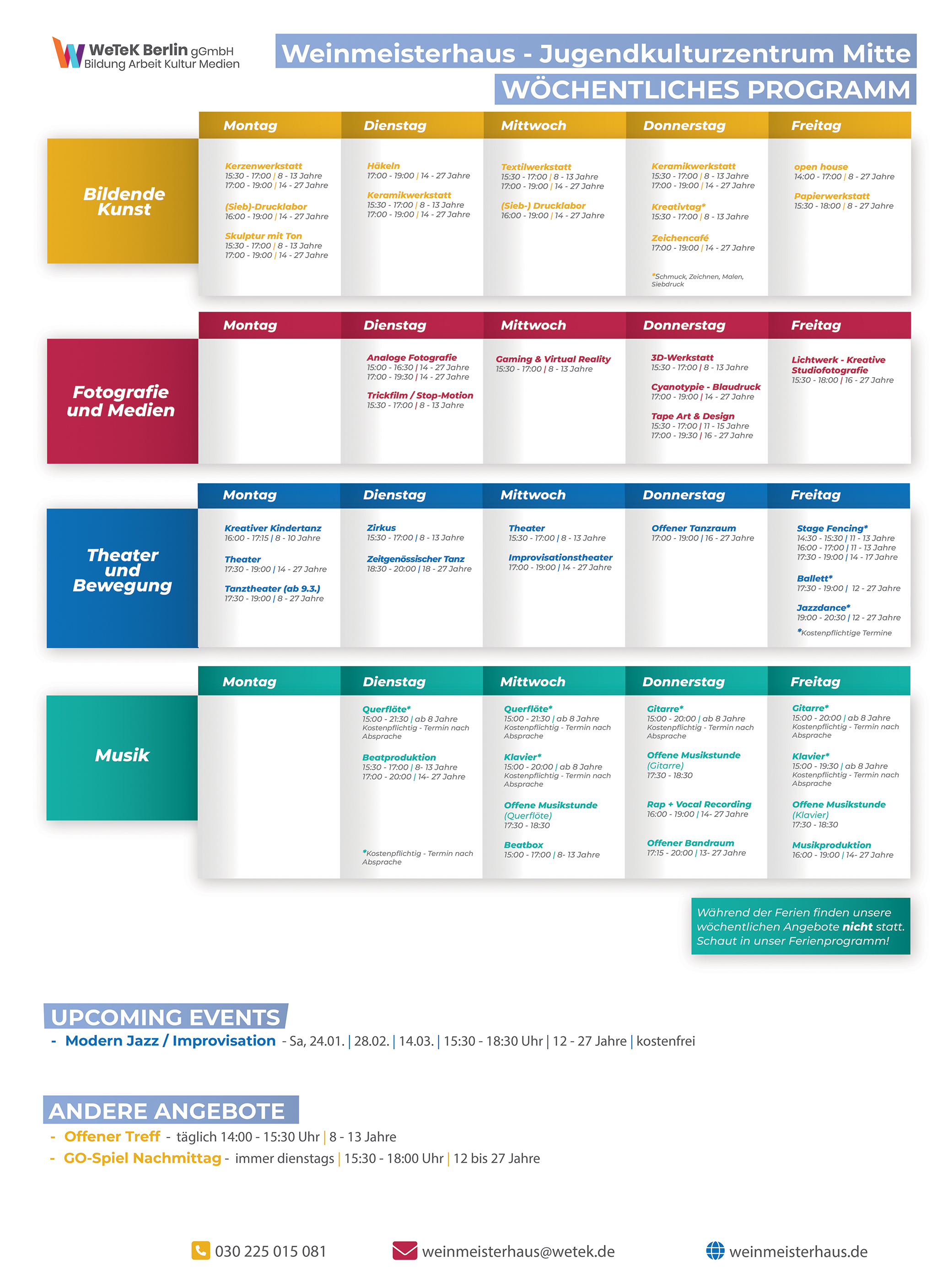 Das Weinmeisterhaus als offenes Jugendkulturzentrum bietet verteilt auf vier Etagen Platz für ein wöchentliches, vielfältiges Programm, das von Angeboten in den Bereichen Bildende Kunst, Theater und Fotografie, über Tanz und Musik bis hin zu medialen Anwendungsbereichen reicht. Ab 14:00 ist das Haus mit diversen Angeboten und verschiedenen Werkstätten für alle geöffnet. Komm vorbei, probiere verschiedene Angebote aus und lass deiner Kreativität freien Lauf.